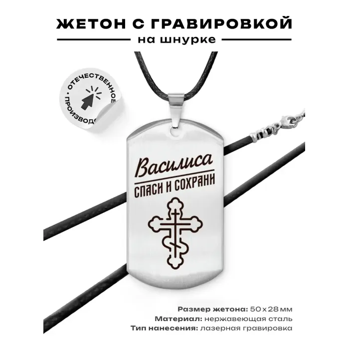 Именной жетон на шнурке — стильный и практичный аксессуар, который станет отличным подарком для близкого человека. Изготовленный из высококачественной нержавеющей стали, он отличается прочностью и долговечностью. Гравировка изображения выполнена с высокой точностью на одной стороне изделия, что придаёт ему уникальность.