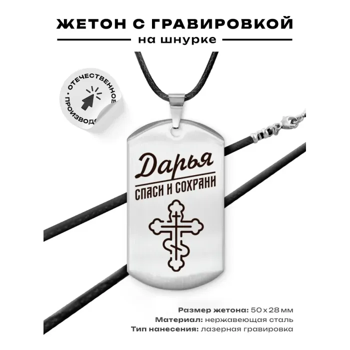 Именной жетон на шнурке — это стильный и практичный аксессуар, который может стать отличным подарком или элементом индивидуального стиля. Изготовленный из высококачественной нержавеющей стали, этот жетон отличается долговечностью и элегантным дизайном. Гравировка изображения выполняется на одной стороне изделия, что добавляет ему уникальности.