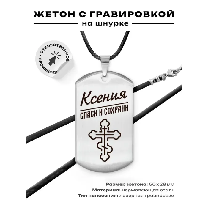 Именной жетон на шнурке — это стильный и практичный аксессуар, выполненный из высококачественной нержавеющей стали. Он станет отличным подарком или индивидуальным элементом для повседневного использования. Жетон украшен гравировкой, которая наносится только с одной стороны, что придаёт ему уникальность.