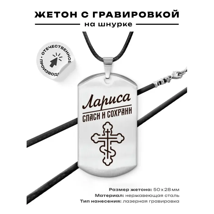 Именной жетон на шнурке — это стильный и практичный аксессуар, выполненный из высококачественной нержавеющей стали. Гравировка изображения на одной стороне изделия придаёт ему уникальность и индивидуальность.