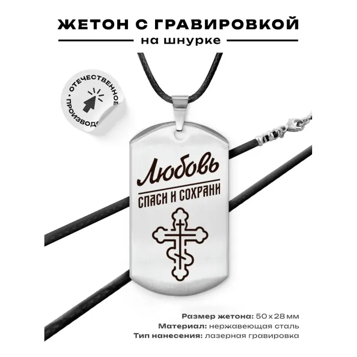 Именной жетон на шнурке «Любовь» — это стильный и оригинальный аксессуар, который станет прекрасным подарком для близких. Изготовленный из высококачественной нержавеющей стали, он отличается прочностью и долговечностью. Гравировка изображения выполняется на одной стороне изделия, что придаёт ему уникальность и индивидуальность.