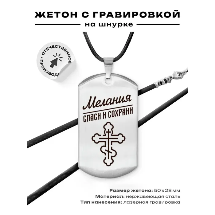 Именной жетон на шнурке Мелания — это стильный и практичный аксессуар, который станет отличным подарком. Изготовленный из высококачественной нержавеющей стали, он отличается прочностью и долговечностью. Гравировка изображения выполняется с одной стороны изделия, что придаёт ему уникальность и индивидуальность.