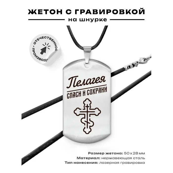 Именной жетон на шнурке Пелагея — это стильный и практичный аксессуар, выполненный из высококачественной нержавеющей стали. Такой жетон станет отличным подарком или сувениром, символизируя индивидуальность и уникальность владельца.