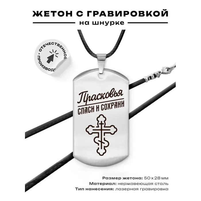 Именной жетон на шнурке Прасковья — стильный аксессуар, который сочетает в себе функциональность и индивидуальность. Изготовленный из высококачественной нержавеющей стали, он станет отличным дополнением к любому образу. Гравировка изображения выполняется на одной стороне изделия, что придаёт ему уникальный характер.