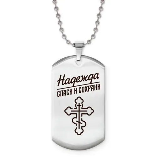 Именной жетон на цепочке "Надежда" — это стильный и практичный аксессуар, который станет отличным подарком для близкого человека. Изготовленный из высококачественной нержавеющей стали, он отличается прочностью и долговечностью. Гравировка изображения выполнена с высокой точностью на одной стороне изделия, что придает ему индивидуальность.