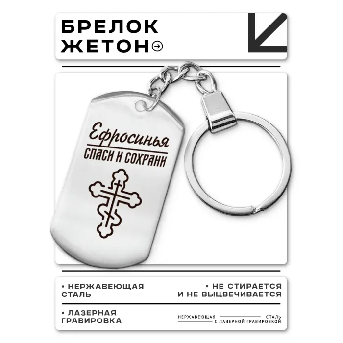 Именной брелок-жетон Ефросинья выполнен из высококачественной нержавеющей стали, что гарантирует долговечность и стильный внешний вид. Этот уникальный аксессуар станет отличным подарком для близкого человека или символом особого момента. Изображение на жетоне нанесено методом гравировки, что придаёт ему индивидуальность и оригинальность.
