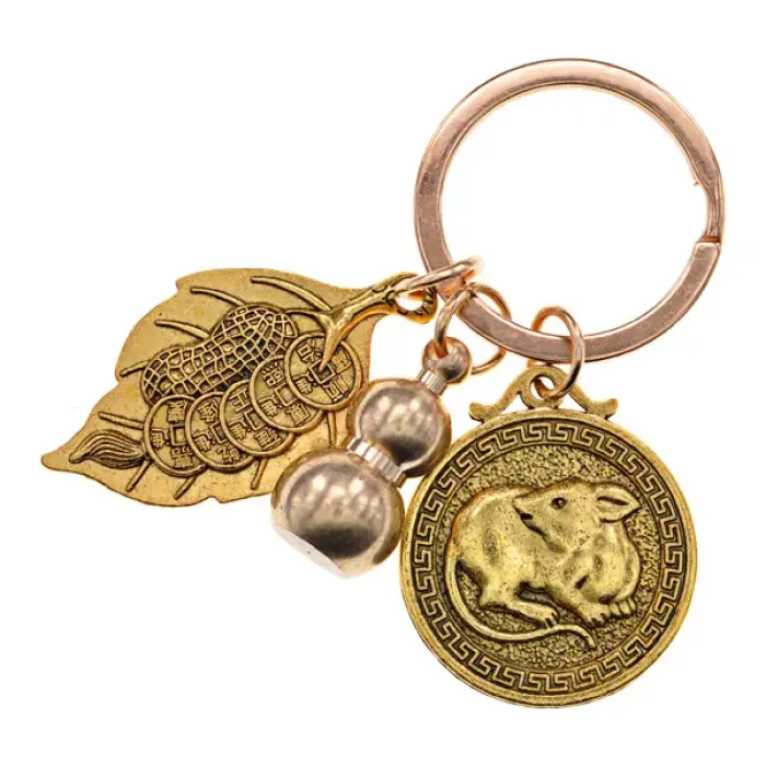 Брелок Восточный гороскоп - Крыса, Пять монет и Тыква-горлянка — это уникальный сувенир, который сочетает в себе символику восточного гороскопа. Он выполнен из металла с элегантным покрытием под золото, что придаёт ему особый шарм. Высота брелка составляет 7,5 см, а ширина — 3 см, что делает его удобным для ношения на ключах или в сумке.