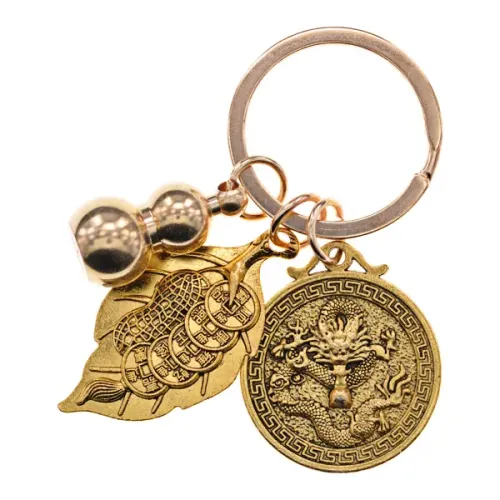 Брелок Восточный гороскоп - Дракон, Пять монет и Тыква-горлянка — это не просто аксессуар, а символ удачи и благополучия. Изготовленный из металла с покрытием под золото, он станет отличным подарком для тех, кто ценит восточную культуру. Высота брелка составляет 7,5 см, ширина — 3 см, что делает его удобным для ношения на ключах или сумке.