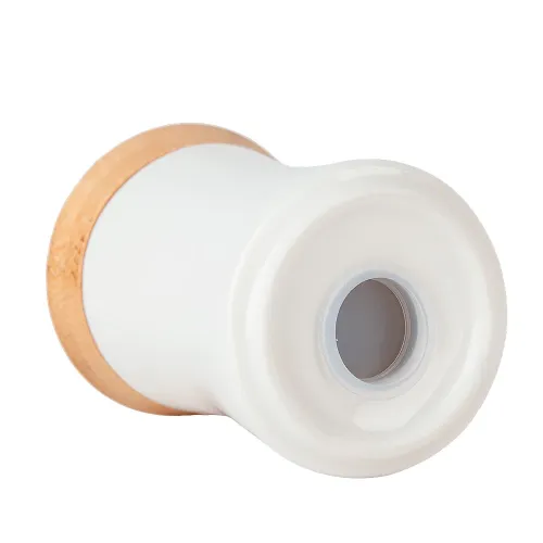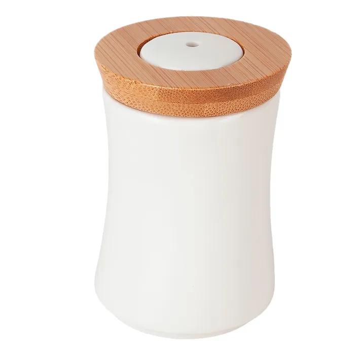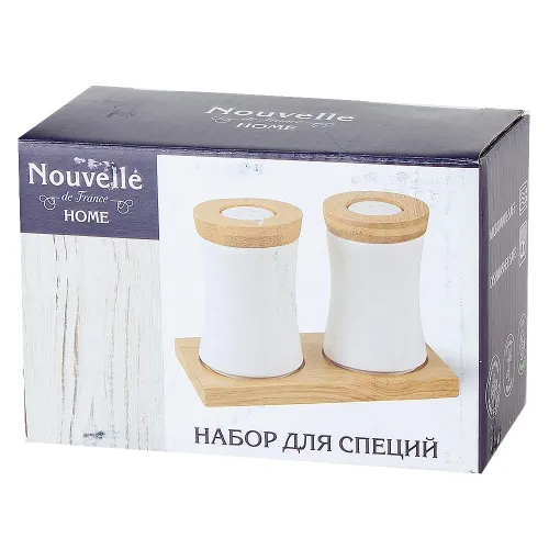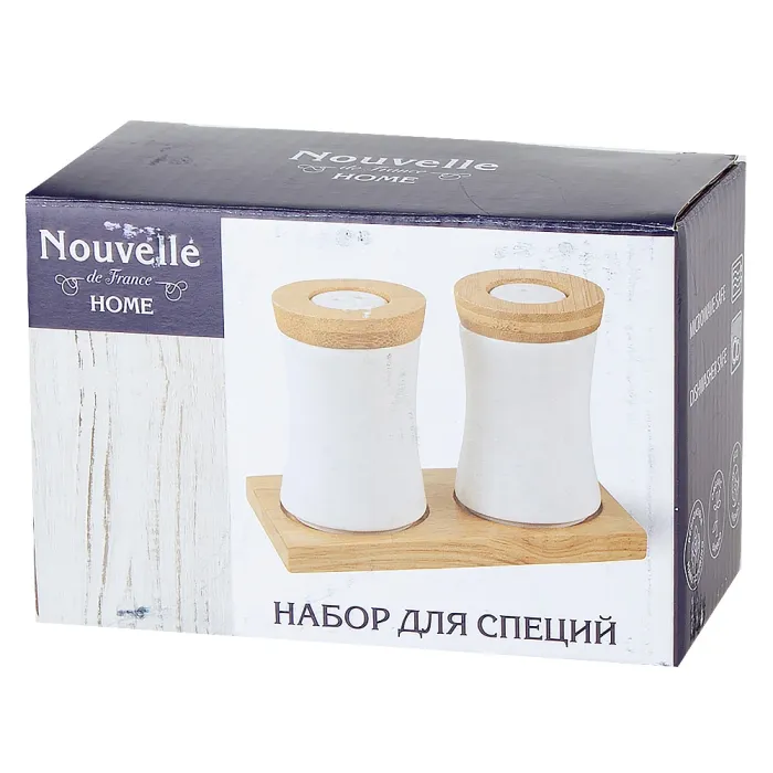 Основные ёмкости для специй изготовлены из фарфора, что обеспечивает гигиеничность и простоту ручного ухода. Бамбуковая подставка служит устойчивой основой, объединяющей предметы в единую композицию. Дизайн набора лаконичный, без рисунка.