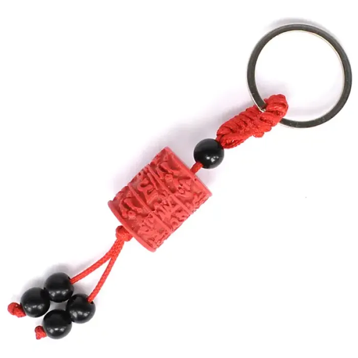 Брелок для ключей из красного пластика, имитирующего киноварь, цилиндрической формы с нанесёнными мантрами.