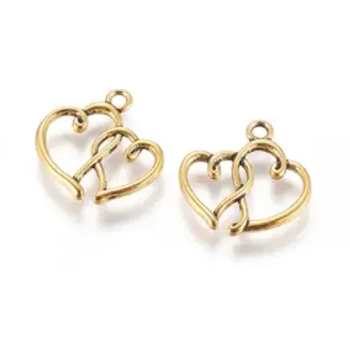 Подвеска для бижутерии в виде двух сердец из металлического сплава с покрытием под золото.