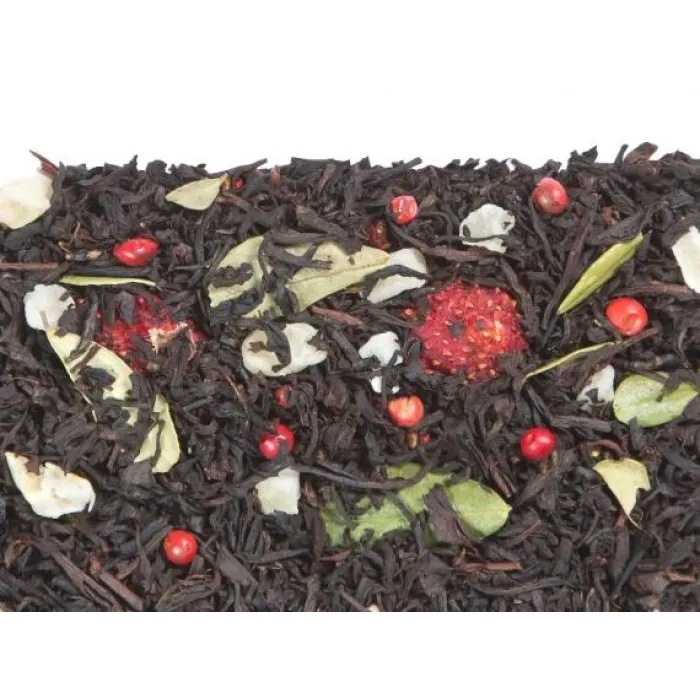 Ароматный купаж на основе терпкого цейлонского чая, создающий атмосферу летнего сада. В основе — крупный лист с добавлением целой клубники, кусочков ананаса и лимона, дополненных нотками брусники и розового перца. Доминирующий аромат — клубника со взбитыми сливками.