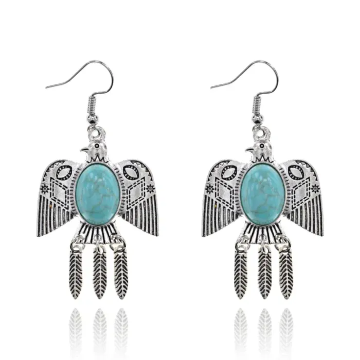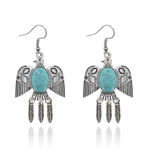 Серьги в виде орла с вставкой из синтетической бирюзы, металлическая основа с покрытием под серебро, замок типа петля.