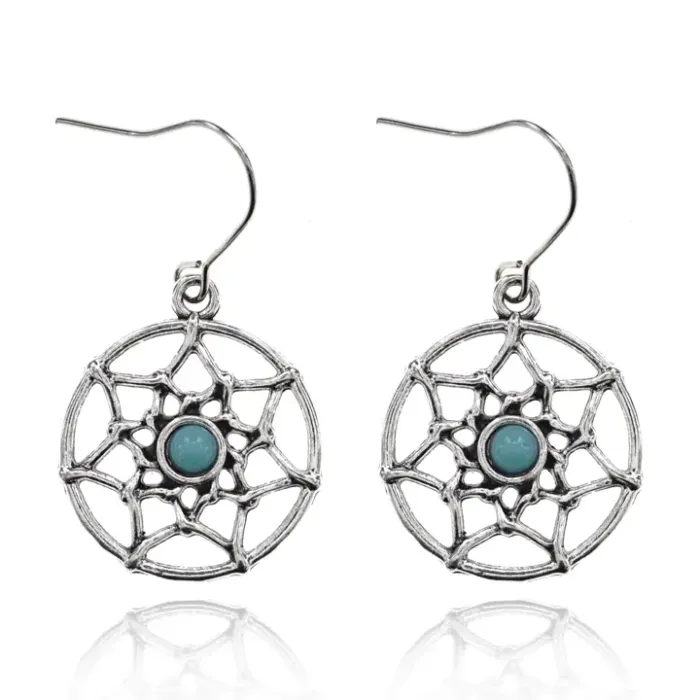 Серьги в виде ловца снов из металла с декоративным элементом из синтетической бирюзы.