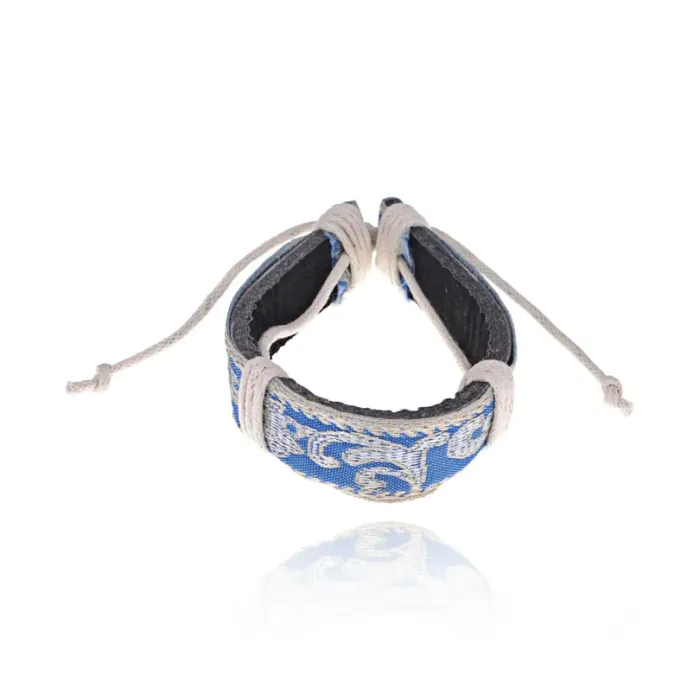 Браслет из натуральной кожи и ткани с орнаментом и регулируемым обхватом.