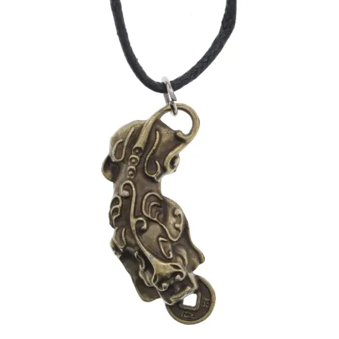 Кулон-амулет из бижутерного сплава с покрытием под бронзу, выполненный в виде символа Пи Щу с монетой.