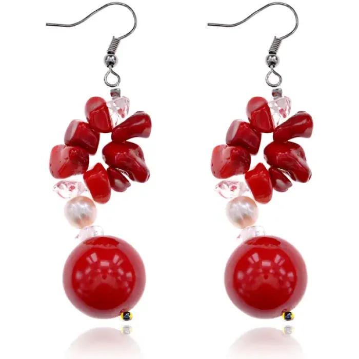 Серьги из бижутерного сплава с вставками из коралла, искусственного жемчуга и стеклянных бусин.