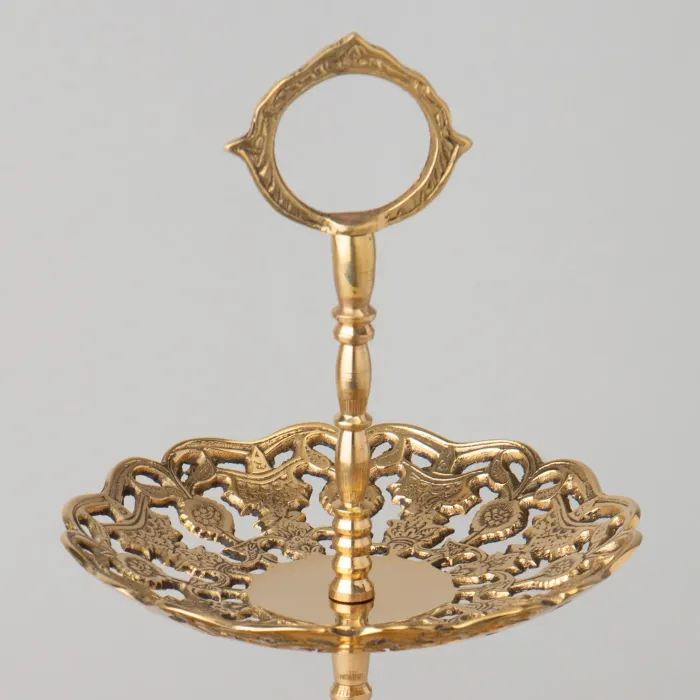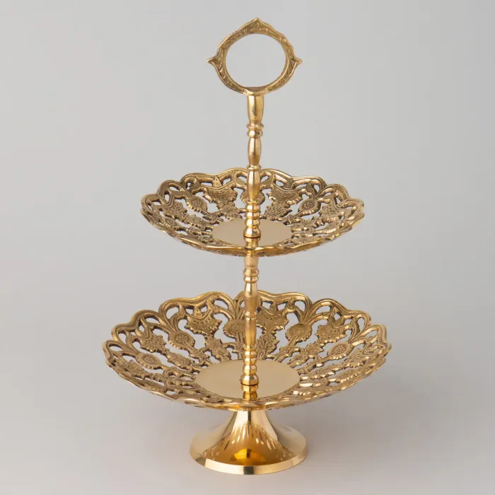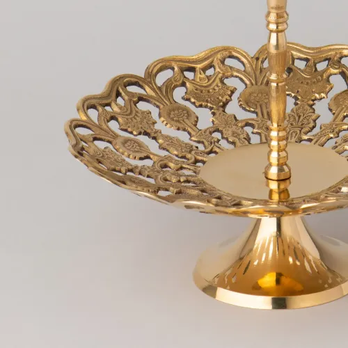 - Материал: латунь- Диаметр ярусов: 11 см и 16 см- Высота: 28 см- Количество предметов в наборе: 1- Особенности ухода: очистка мягкими моющими средствами, без абразивов