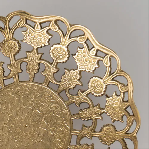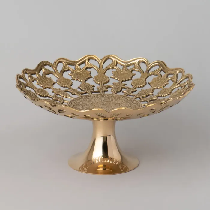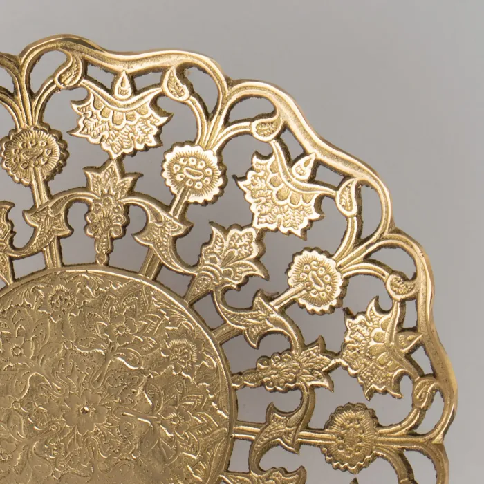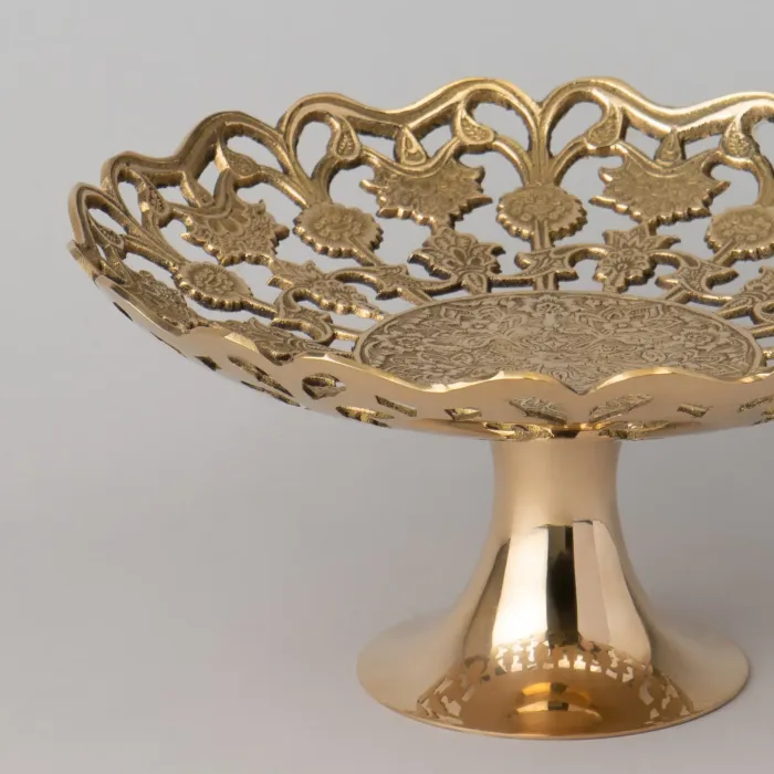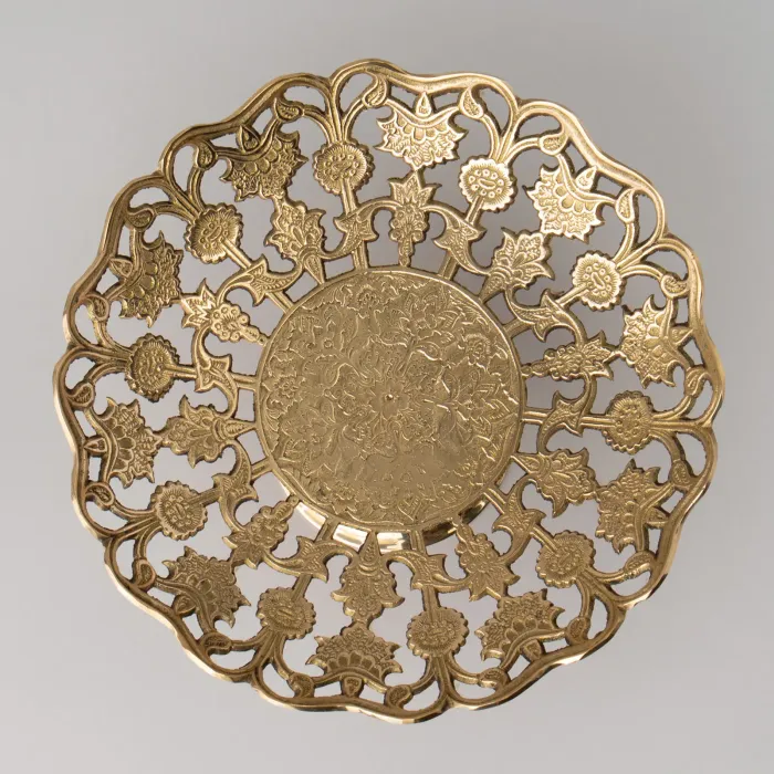 Латунь является экологичным материалом, устойчивым к коррозии. Поверхность блюда имеет полированную отделку, обеспечивающую характерный блеск. Конструкция изделия представляет собой цельную форму без дополнительных ручек или крышки.