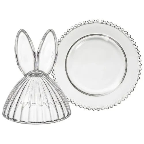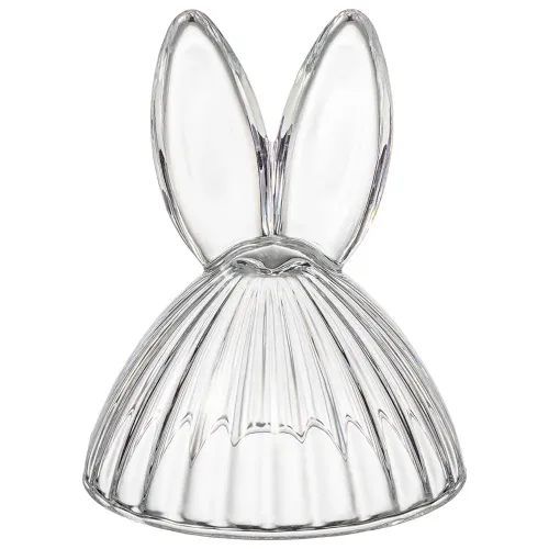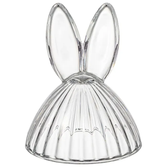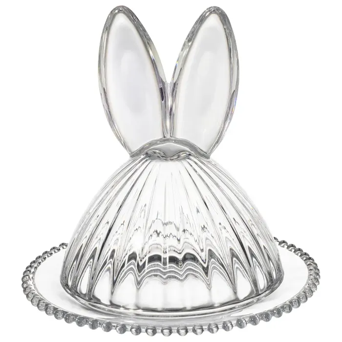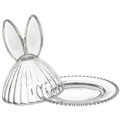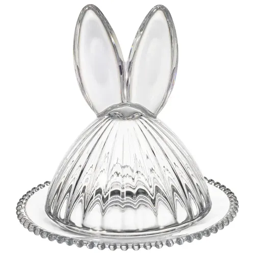 Блюдо изготовлено из прозрачного стекла, безопасного для контакта с пищевыми продуктами. Конструкция включает плотно прилегающую крышку, которая способствует сохранению свежести продуктов. Декоративные элементы в виде ушек и рельефный край являются частью дизайна серии Rabbit Family.