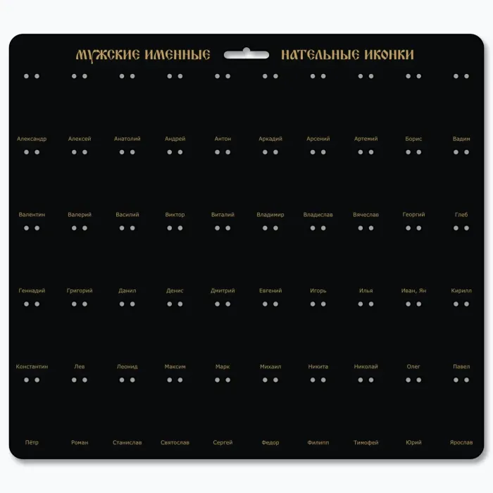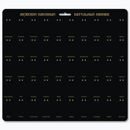 Стенд для именных нательных иконок, представляющий 50 наиболее популярных мужских имен. Этот уникальный сувенир выполнен из прочного ХДФ, что обеспечивает долговечность и эстетичный внешний вид. Размер стенда составляет 31 на 28 см, что делает его удобным для размещения в любом интерьере.