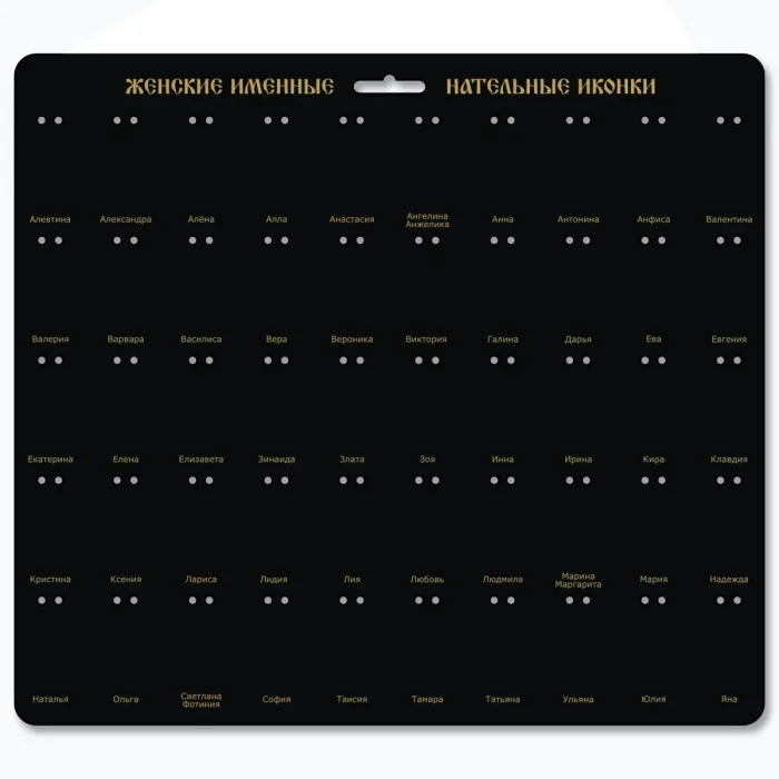 Стенд для именных нательных иконок включает 50 наиболее популярных женских имен, что делает его идеальным подарком или украшением для любого случая. Изготовленный из прочного ХДФ, стенд обладает размером 31 на 28 см, что позволяет удобно разместить его в любом интерьере.