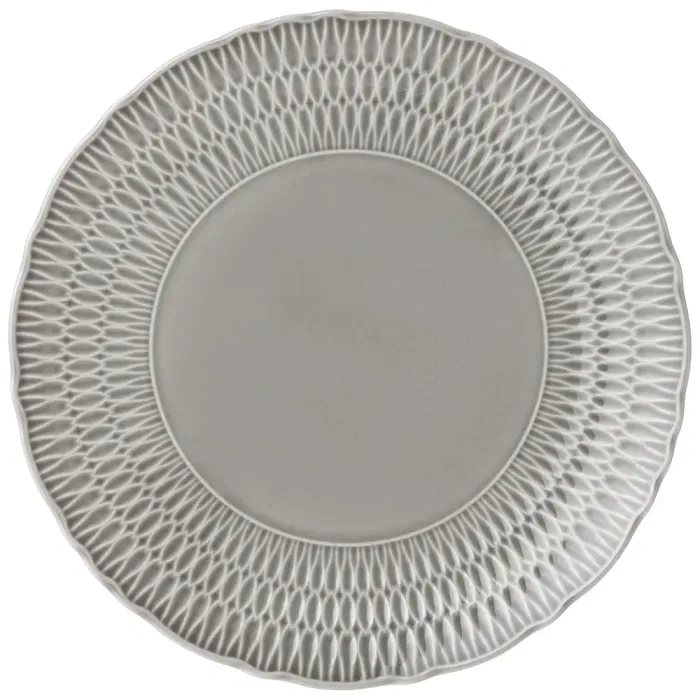 Тарелка выполнена из высококачественного фарфора, покрытого глазурью. Мягкие линии и серая окраска формируют её дизайн. Края и дно изделия сконструированы для устойчивости на столе.