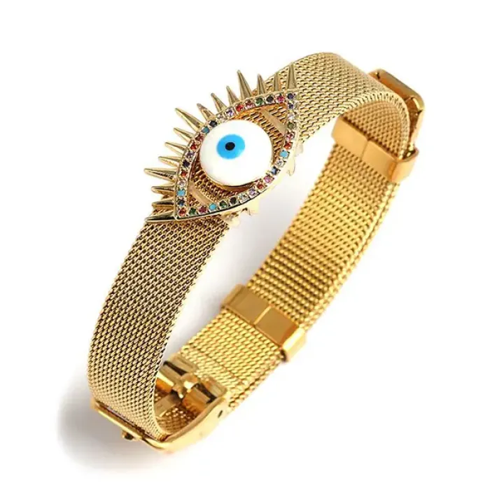 Браслет-амулет от сглаза из бижутерного сплава с покрытием под золото и эмалью, декорированный стразами.