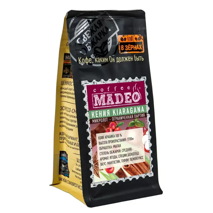 Плантационный кофе Madeo из Кении, выращенный на высоте 1700 метров. Средняя обжарка раскрывает сложный профиль с нотами мангостина, карамели-ириски и лемонграсса, переходящими в пряно-шоколадное послевкусие. Кофе обладает плотным телом, сбалансированной кислотностью и умеренной горчинкой.