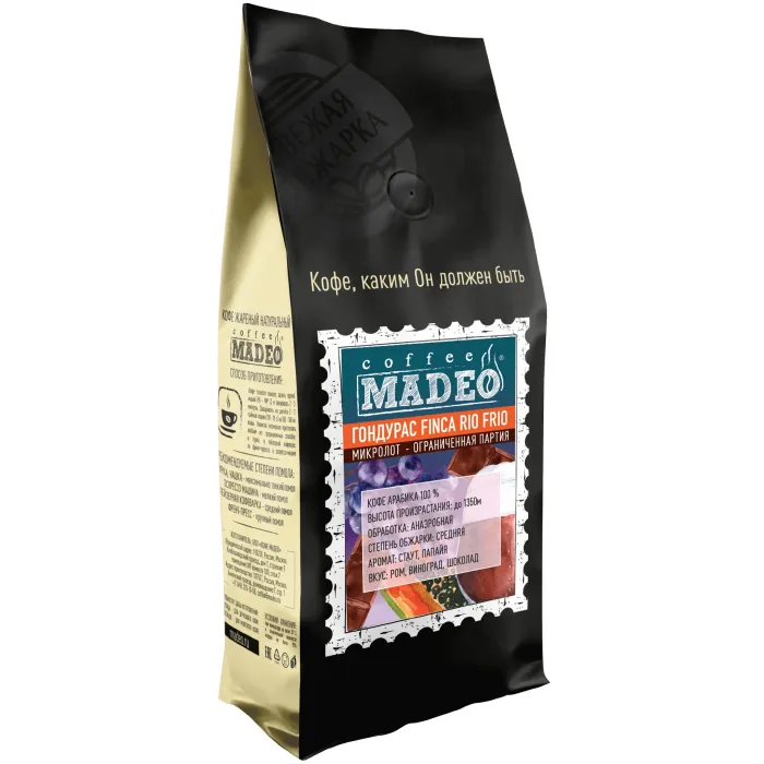 Плантационный кофе Madeo из Гондураса — это высококачественная арабика с плантации Finca Rio Frio в регионе Копан. Средняя обжарка раскрывает плотное тело с низкой кислотностью и балансом сладости и горчинки. Во вкусе и аромате доминируют ноты выдержанного рома, карамели, тёмного шоколада, красного винограда, а также солодовые оттенки крепкого стаута и спелой папайи.