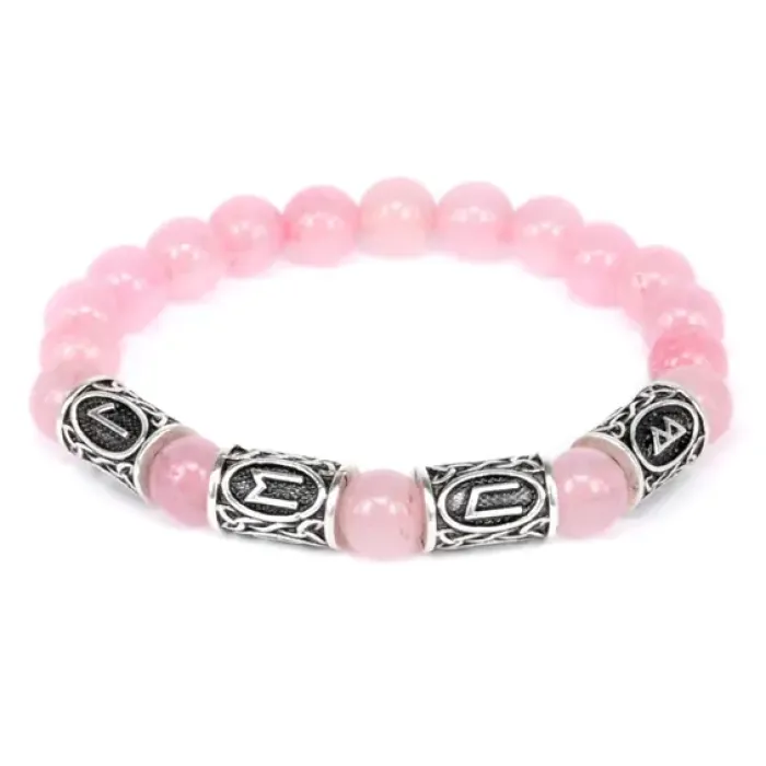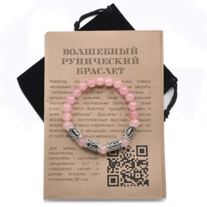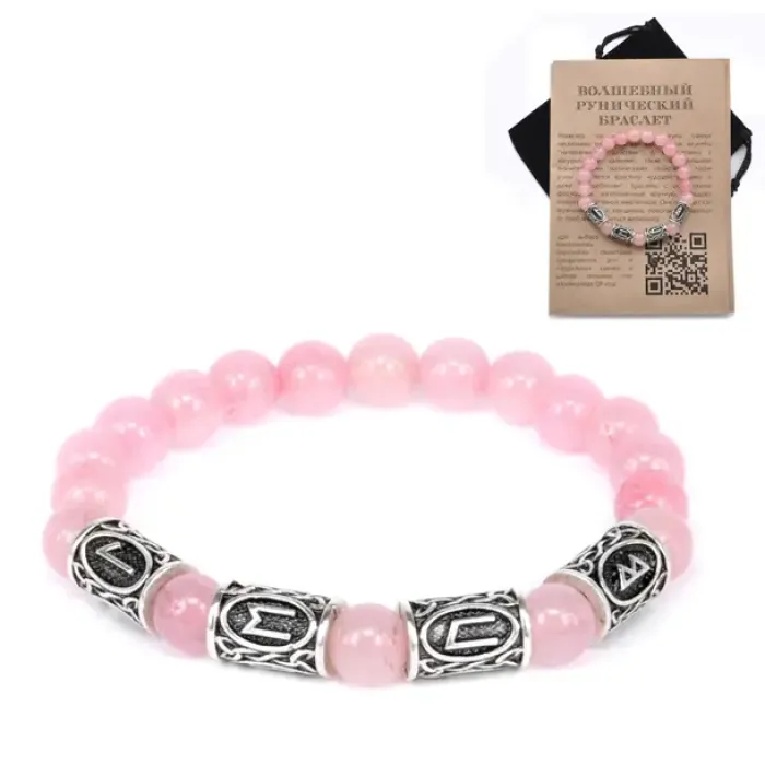 Рунический браслет из розового кварца с нанесёнными рунами.