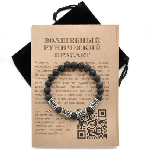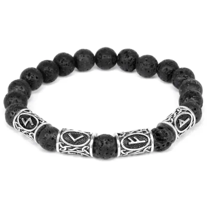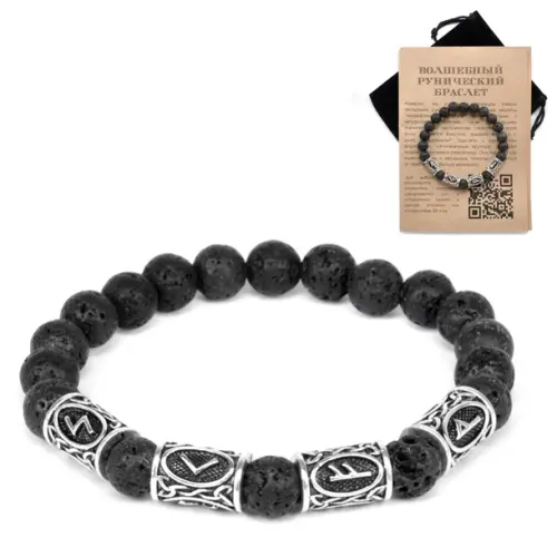 Рунический браслет из натурального камня лавы с нанесёнными рунами Соулу, Кеназ, Феху и Вуньо. Конструкция — стрейч.