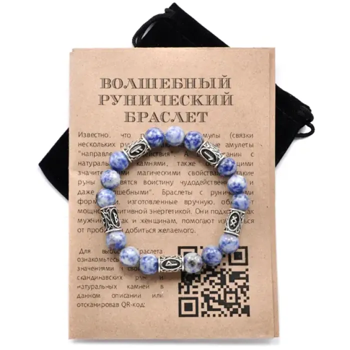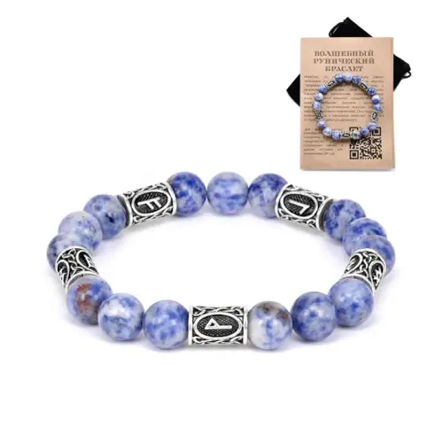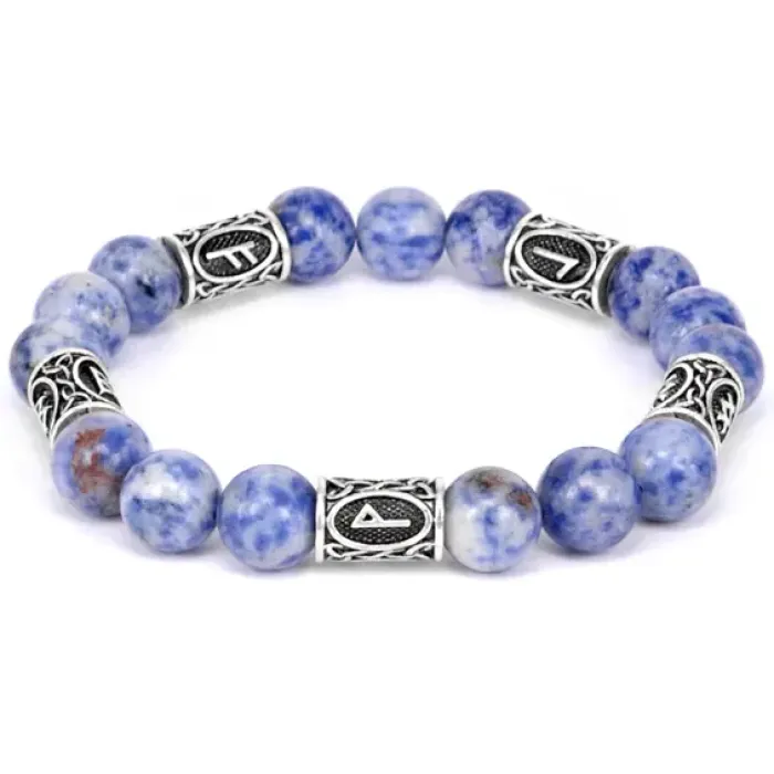 Рунический браслет из содалита с нанесёнными рунами Феху, Беркана, Вуньо, Ингуз и Лагуз.