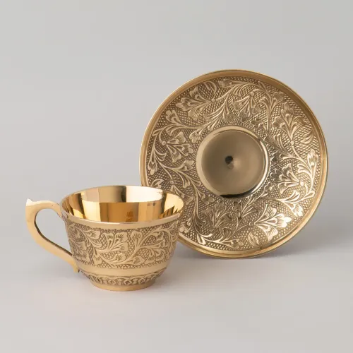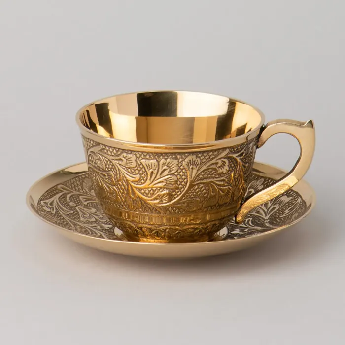 Посуда выполнена из латуни — сплава, устойчивого к коррозии. Поверхность изделия отполирована для создания блестящего декоративного эффекта. Конструкция представляет собой классическую пару из чашки и блюдца, где блюдце служит подставкой и элементом сервировки.