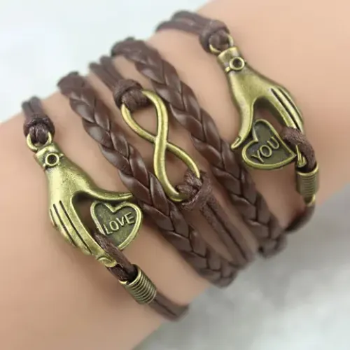 Плетёный браслет из кожи, ткани и металла с символикой любви.