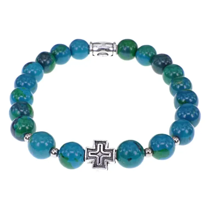 - Стрейч-браслет из бусин синтетической хризоколлы диаметром 8 мм, который удобно сидит на запястье;