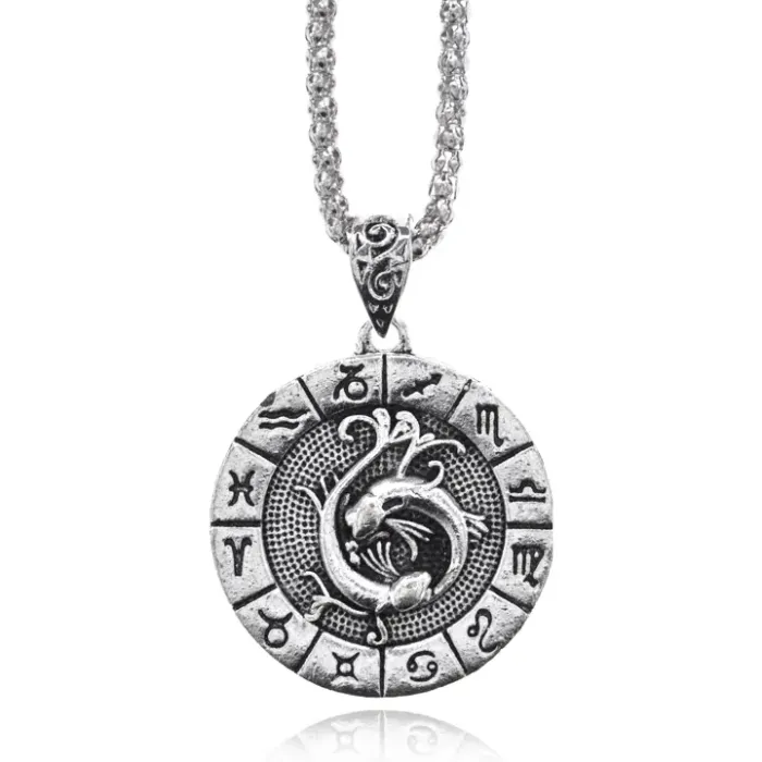 Амулет Знаки Зодиака - Рыбы на цепочке является символом интуиции и чувствительности. Этот стильный аксессуар выполнен из металла с покрытием под серебро, что придаёт ему элегантный вид. Диаметр амулета составляет 33 мм, а длина цепочки — 65 см, что делает его удобным для ношения. Замок типа лобстер обеспечивает надёжность и безопасность. Традиционно считается, что амулеты знаков зодиака помогают в поиске гармонии и защиты от негативных энергий.