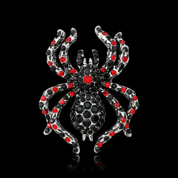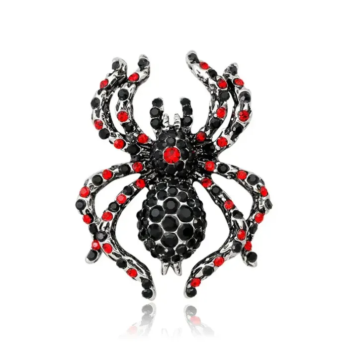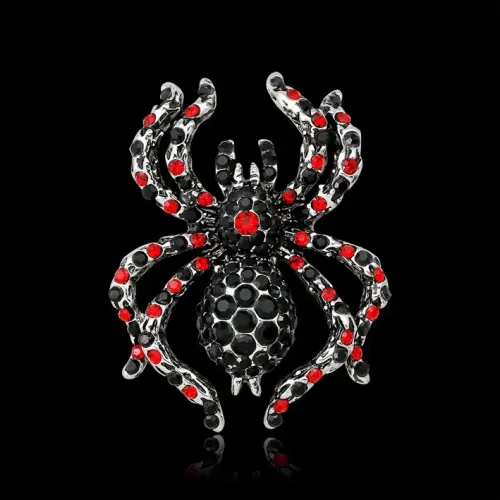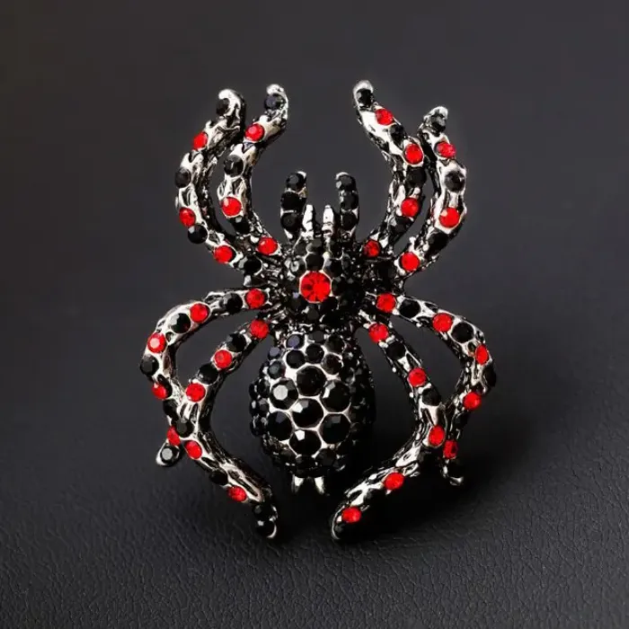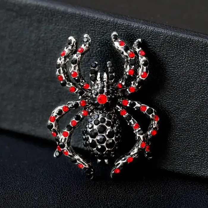 Брошь в виде паука для украшения одежды, изготовленная из бижутерного сплава с покрытием под серебро и стразами.