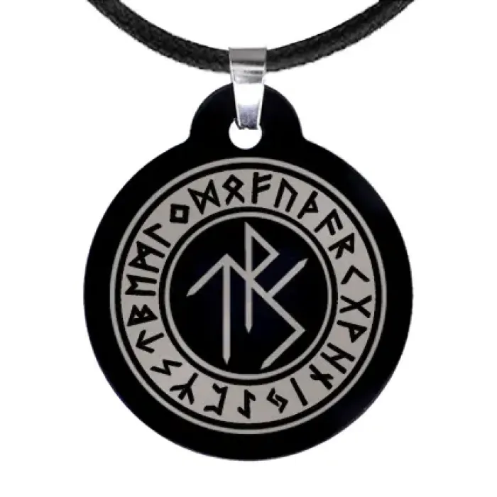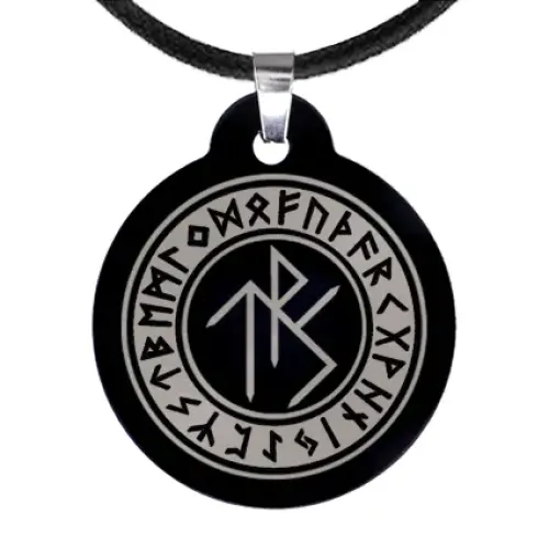 Материал и изготовление: Бижутерный сплав на основе алюминия с чёрным покрытием. Украшен лазерной гравировкой рун Тейваз, Райдо и Соулу.