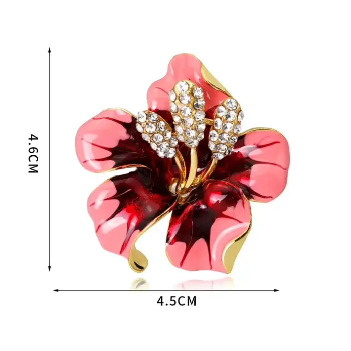 Брошь в форме цветка из бижутерного сплава с эмалевым покрытием, стразами и золотым покрытием.
