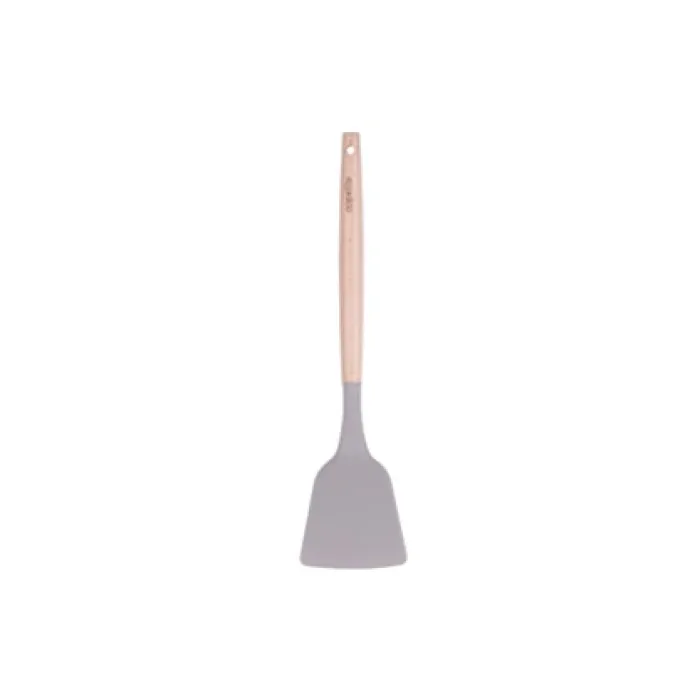 Рабочая поверхность изготовлена из силикона, что обеспечивает бережное обращение с посудой, предотвращает появление царапин и совместимо с антипригарными покрытиями. Ручка из дерева удобна для захвата и обладает низкой теплопроводностью, не нагреваясь в процессе использования.
