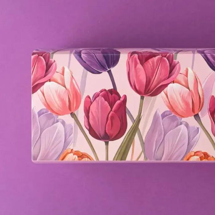 Картонная упаковка (шубер) из серии «8 Марта. Тюльпаны» предназначена для оформления подарочных наборов из трёх банок. Дизайн с фиолетовыми тюльпанами соответствует весенней тематике.
