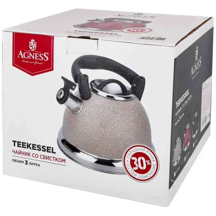 Чайник со свистком объёмом 3 литра предназначен для кипячения воды на плите. Изделие выполнено из нержавеющей стали, оснащено индукционным капсульным дном для равномерного нагрева и складывающейся ручкой.