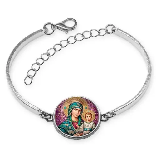 Браслет из бижутерного сплава — это не только стильный аксессуар, но и символ веры. Изображение Богородицы с Иисусом под выпуклой стеклянной линзой создает эффект глубины и придаёт изделию уникальность.
