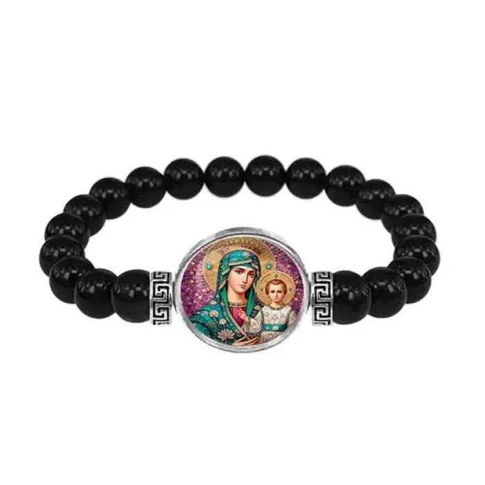 Стрейч-браслет из натурального камня Чёрный агат диаметром 8 мм — это не только стильное украшение, но и символ духовности. Изображение Богородицы с Иисусом диаметром 20 мм защищено выпуклой стеклянной линзой и размещено на сеттинге из бижутерного сплава с покрытием под серебро. Такой браслет станет прекрасным подарком для тех, кто ценит уникальные аксессуары с глубоким смыслом. Он идеально подходит как для повседневной носки, так и для особых случаев, добавляя изысканность любому образу.