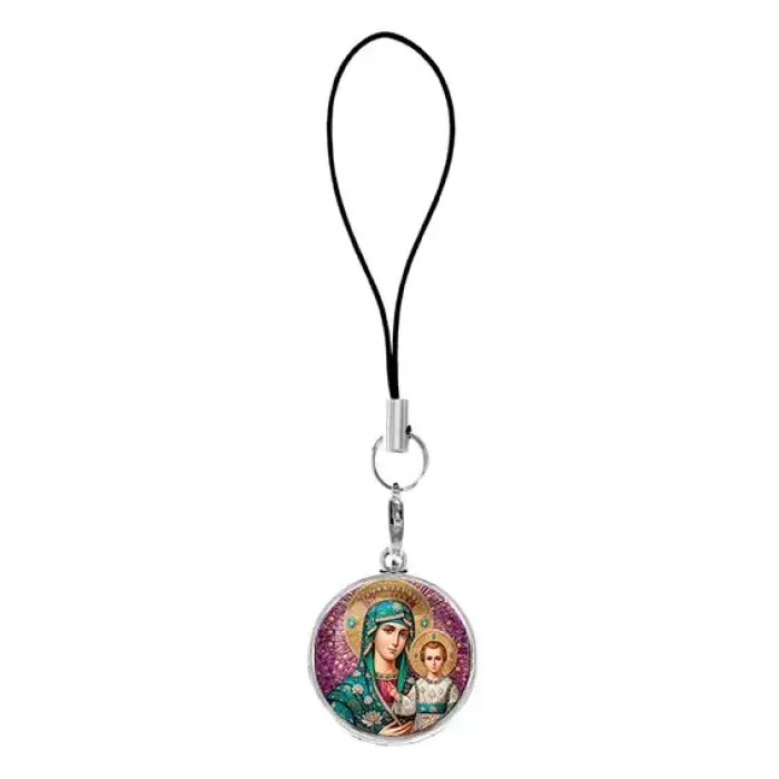 Подвеска для телефона — это стильный и символичный аксессуар, который сочетает в себе красоту и духовность. Изображение Богородицы с Иисусом выполнено под выпуклой стеклянной линзой, что придаёт ему особую выразительность.