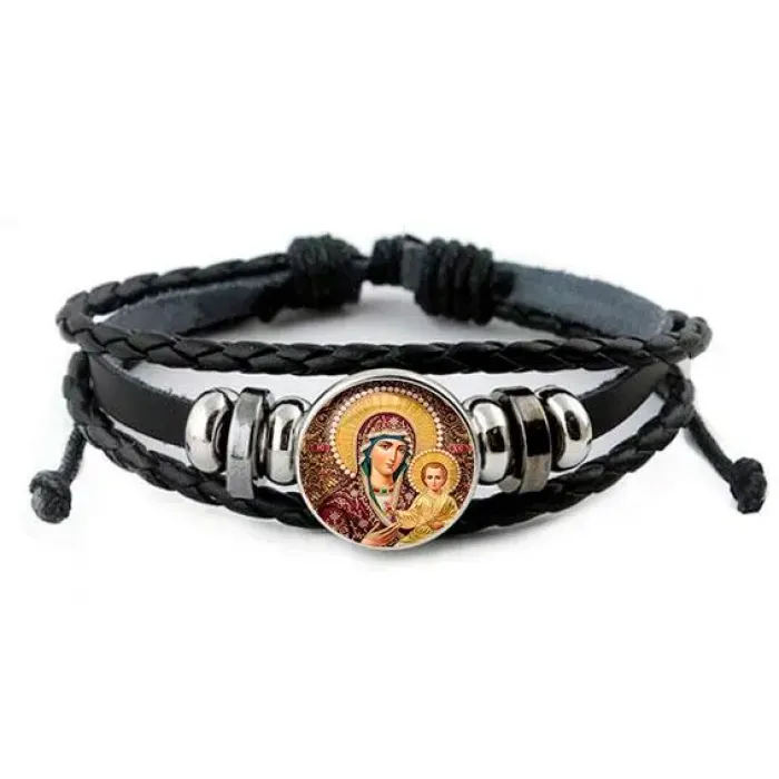 Браслет из искусственной кожи — это не просто аксессуар, а символ веры и духовности. Изображение Богородицы с Иисусом под выпуклой стеклянной линзой диаметром 20 мм придаёт изделию особую значимость.