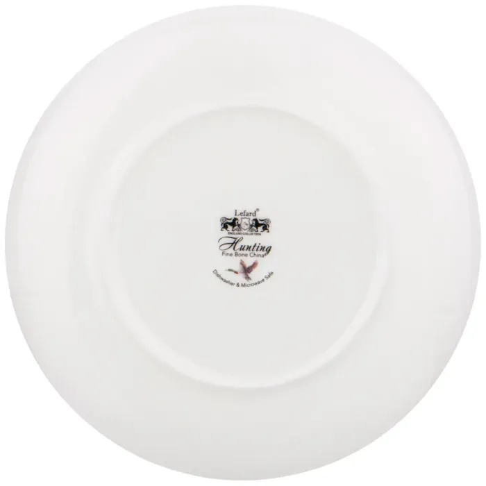 Тарелка выполнена из костяного фарфора, что обеспечивает изделию прочность и белизну. Поверхность украшена декором с традиционным сюжетом на тему охоты, нанесённым на белую основу. Современная форма тарелки и теплые тона рисунка создают гармоничный внешний вид.