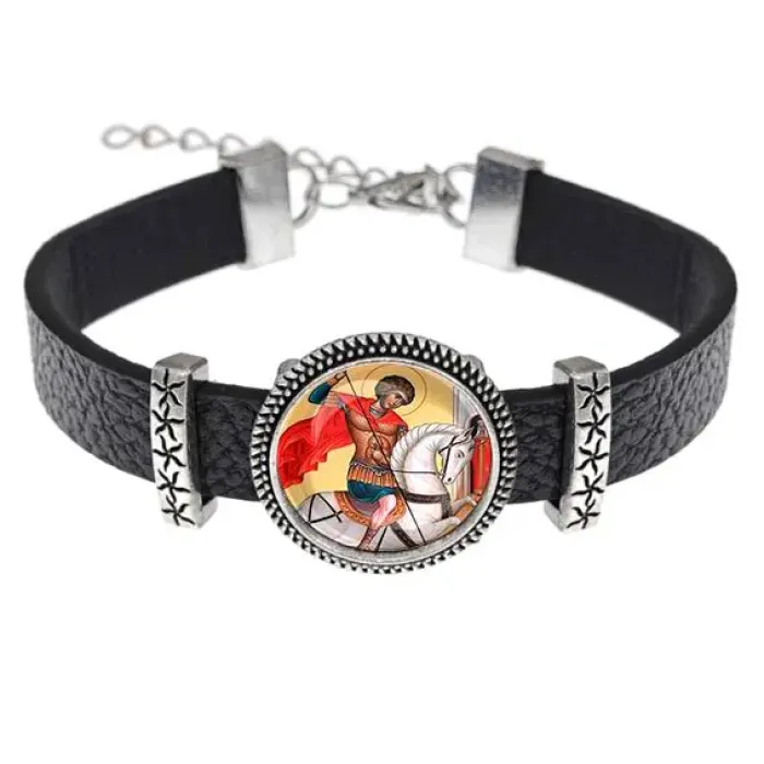 Кожаный браслет с изображением Георгия Победоносца — это не только стильный аксессуар, но и символ мужества и победы. Изготавливается из искусственной кожи и украшен выпуклой стеклянной линзой диаметром 20 мм, что придаёт ему уникальный вид.