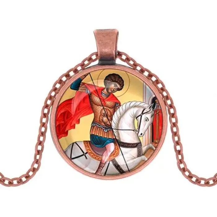 Этот кулон в цвете меди с изображением Георгия Победоносца станет не только стильным аксессуаром, но и символом мужества и победы. Изготовленный из бижутерного сплава с покрытием под медь и стекла, он сочетает в себе прочность и элегантность. Диаметр кулона составляет 28 мм, а длина цепочки — 60 см, что делает его удобным для ношения на любой одежде. Застёжка типа лобстер обеспечивает надежную фиксацию. Изображение защищено выпуклой стеклянной линзой, что добавляет дополнительный шарм этому уникальному изделию.